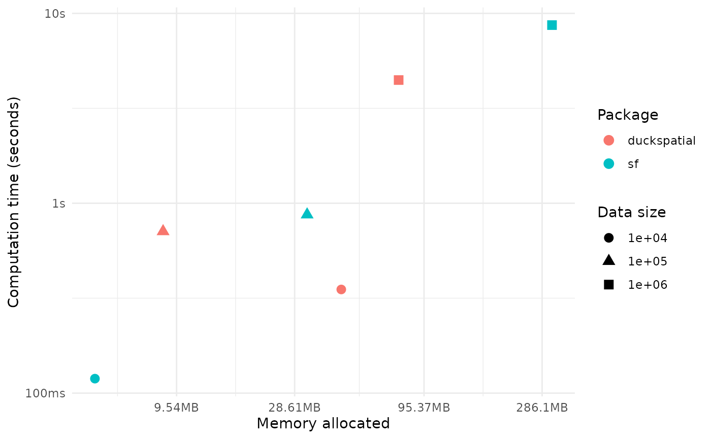 This vignette shows a few benchmarks comparing {duckspatial} vs {sf}. We look at how both packages compare in terms of computation time and memory use when performing different spatial operations with increasingly large data sets. We plan to extend this vignette in the future to benchmark other types of spatial operations.