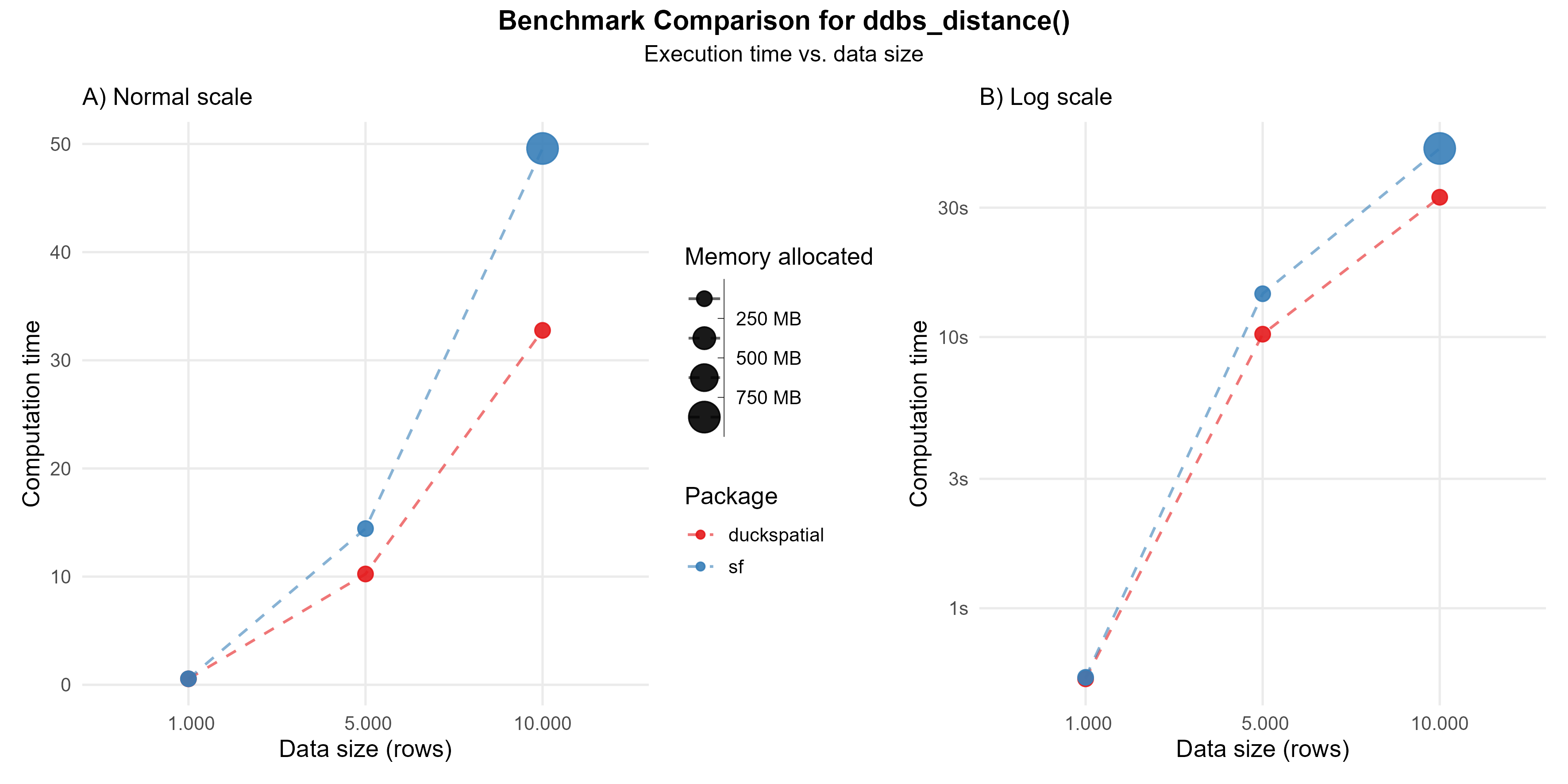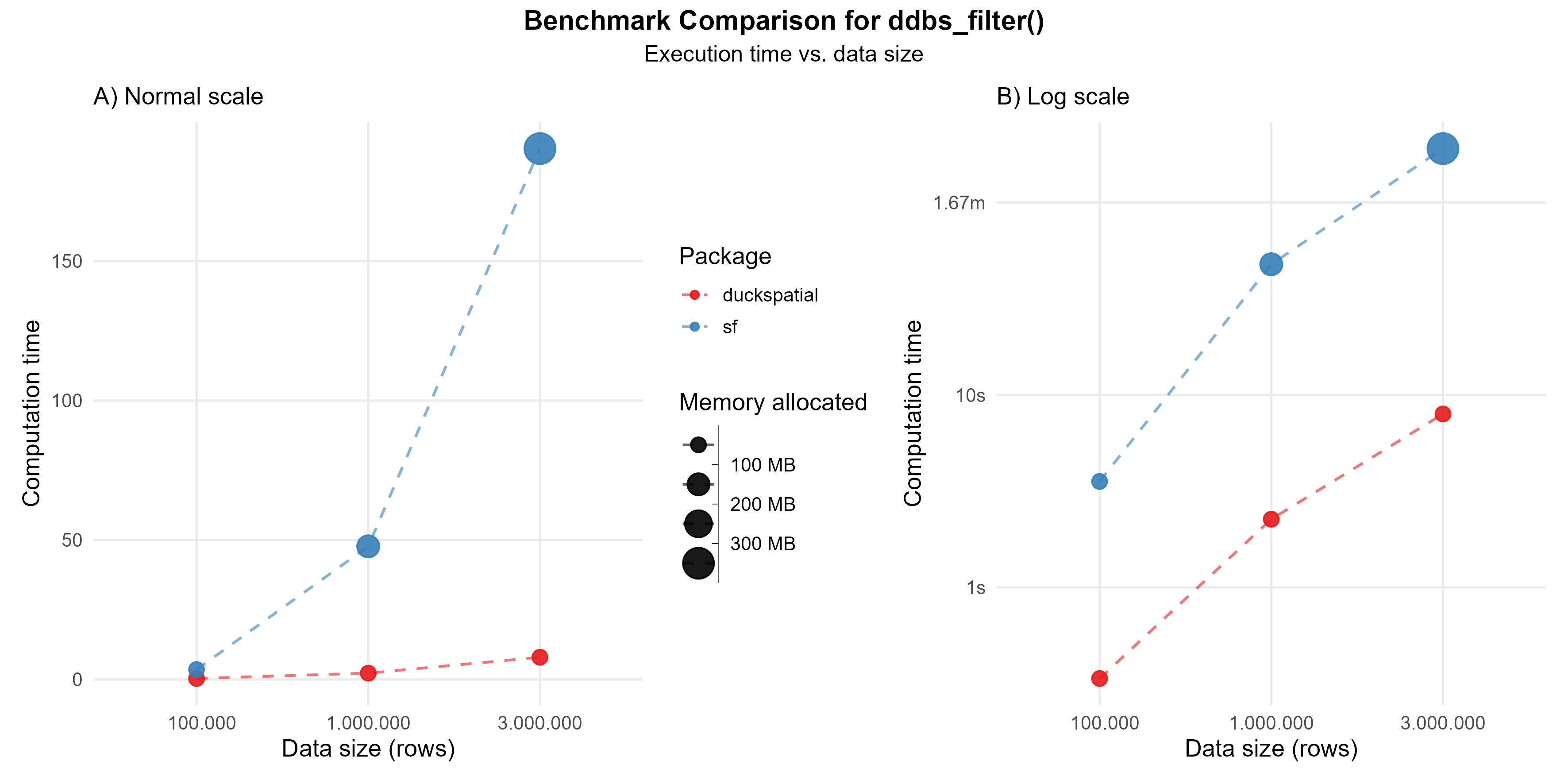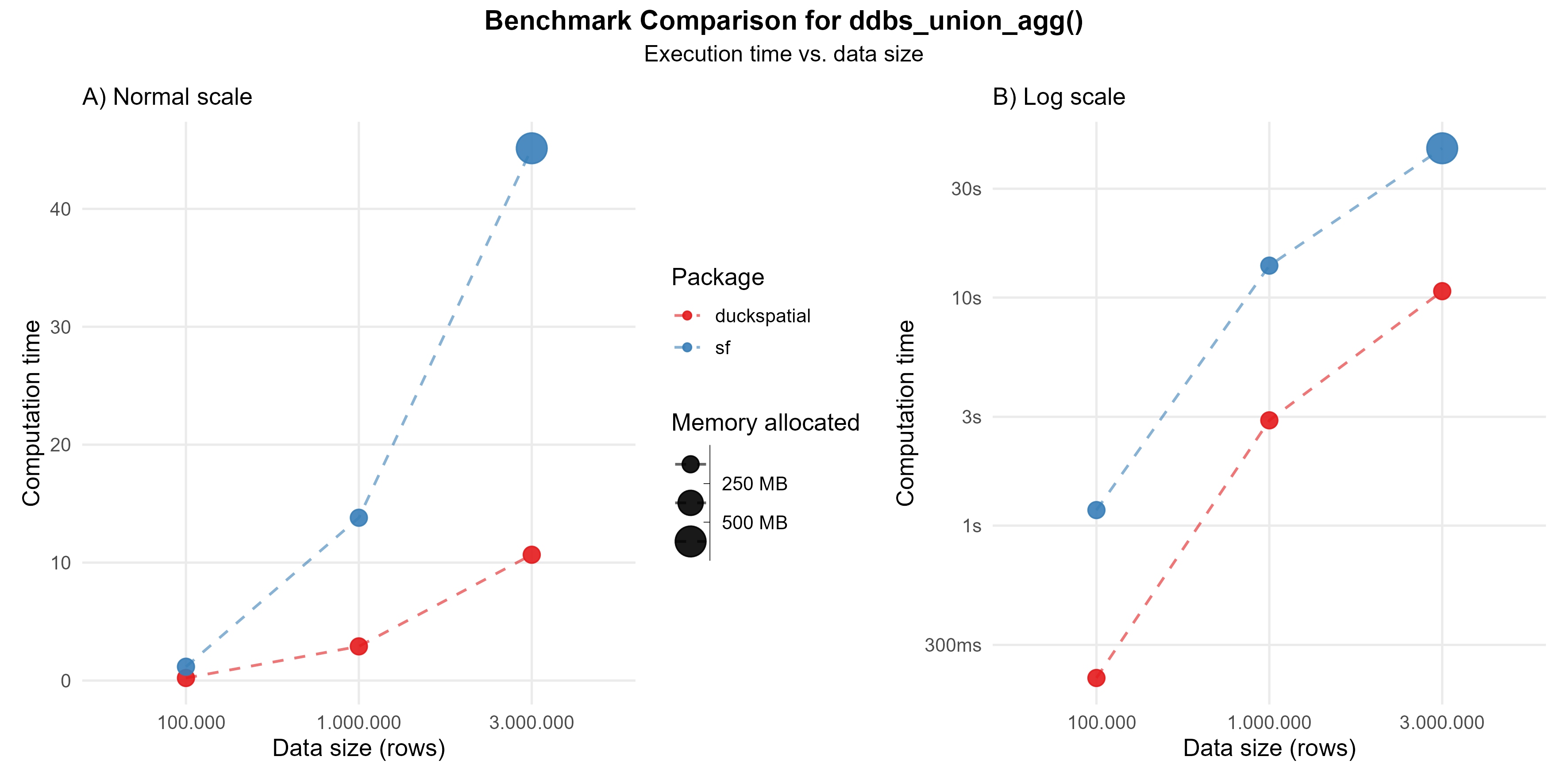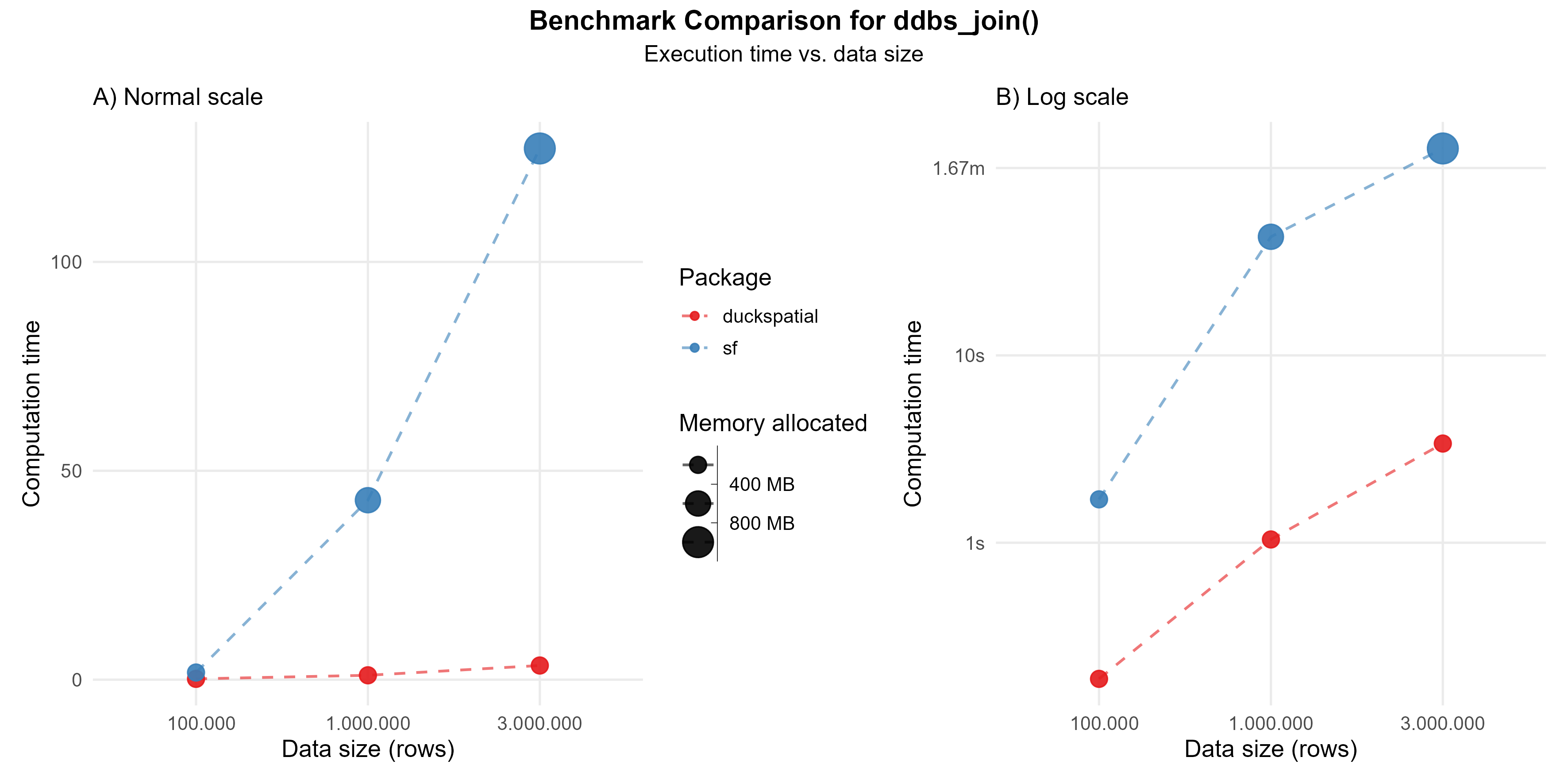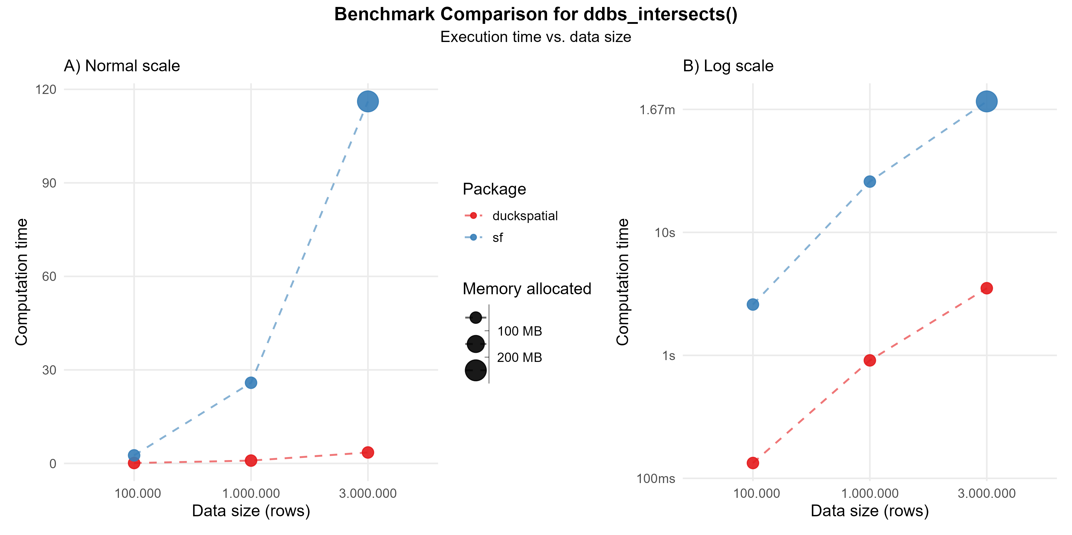 This operation can be intensive. In the current version of {duckspatial} we see an improvement in speed and memory usage in bigger datasets, as shown in Figure 1.